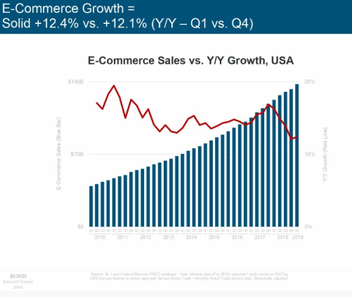 电美国子商务去年第四季度环比第一季度增长12.1%。实体零售同比增长2%。